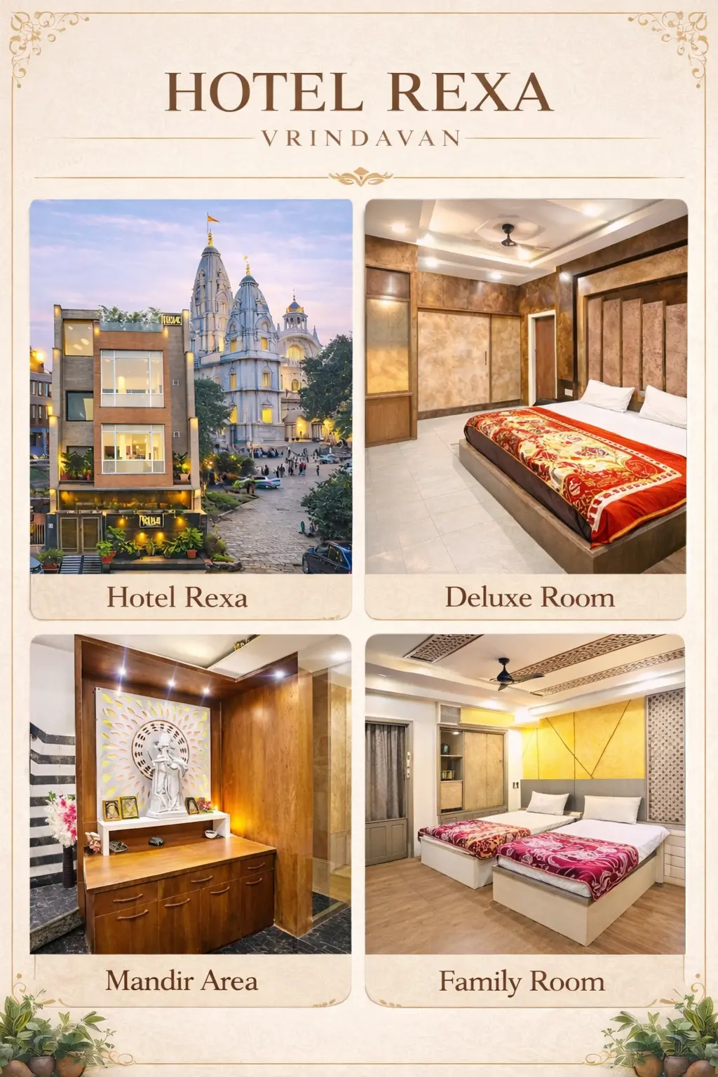 Our hotel in Vrindavan delivers effectively designed accommodation to suit the requirements of families, devotees & travelers. We have been thoughtful towards functionality, cleanliness & comfort in every room. This ensures a peaceful stay after temple visits & city exploration.